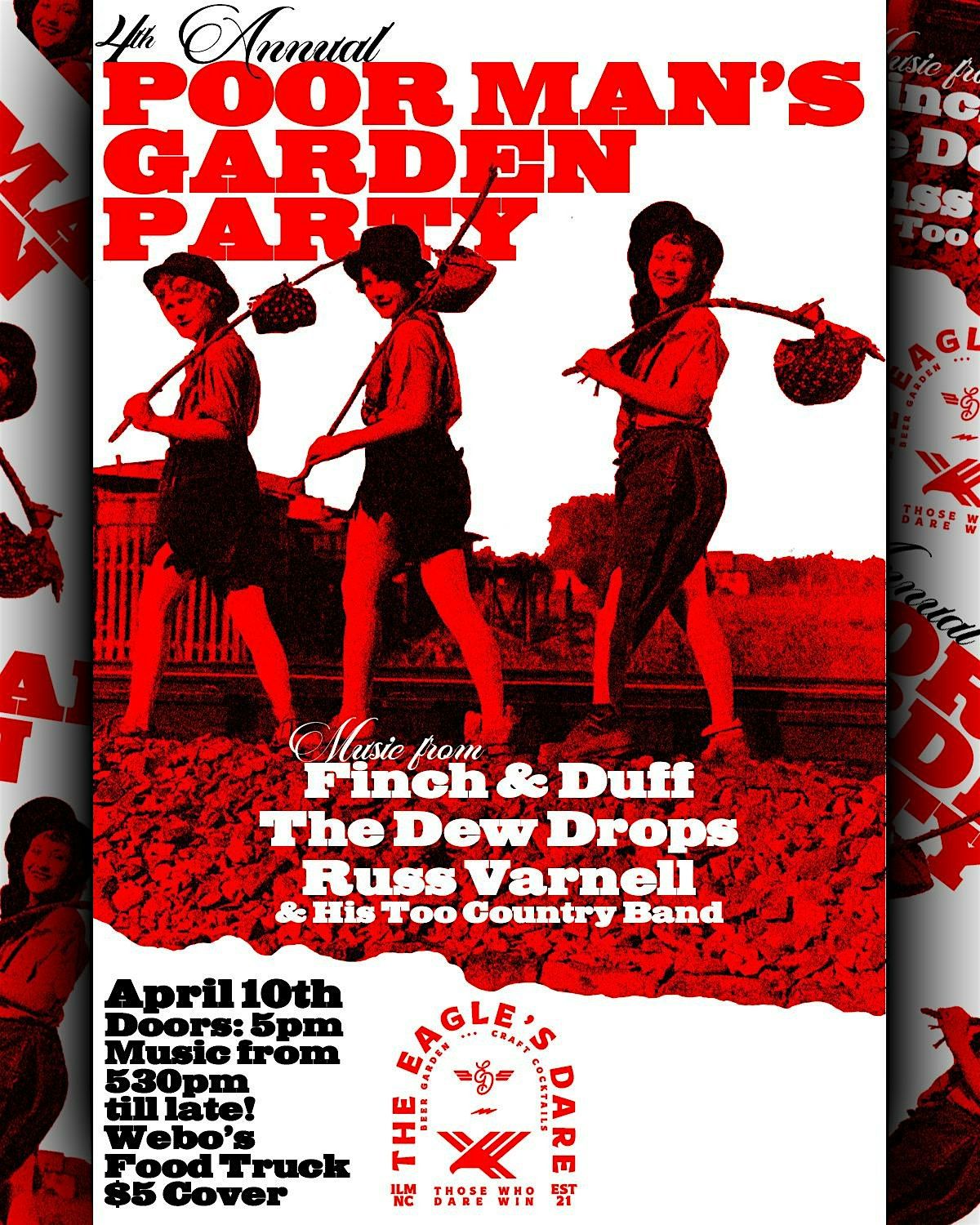 Skip the fancy and come get rowdy at The Poor Man’s Garden Party at The Eagle’s Dare on Friday, April 10th from 5–11pm!