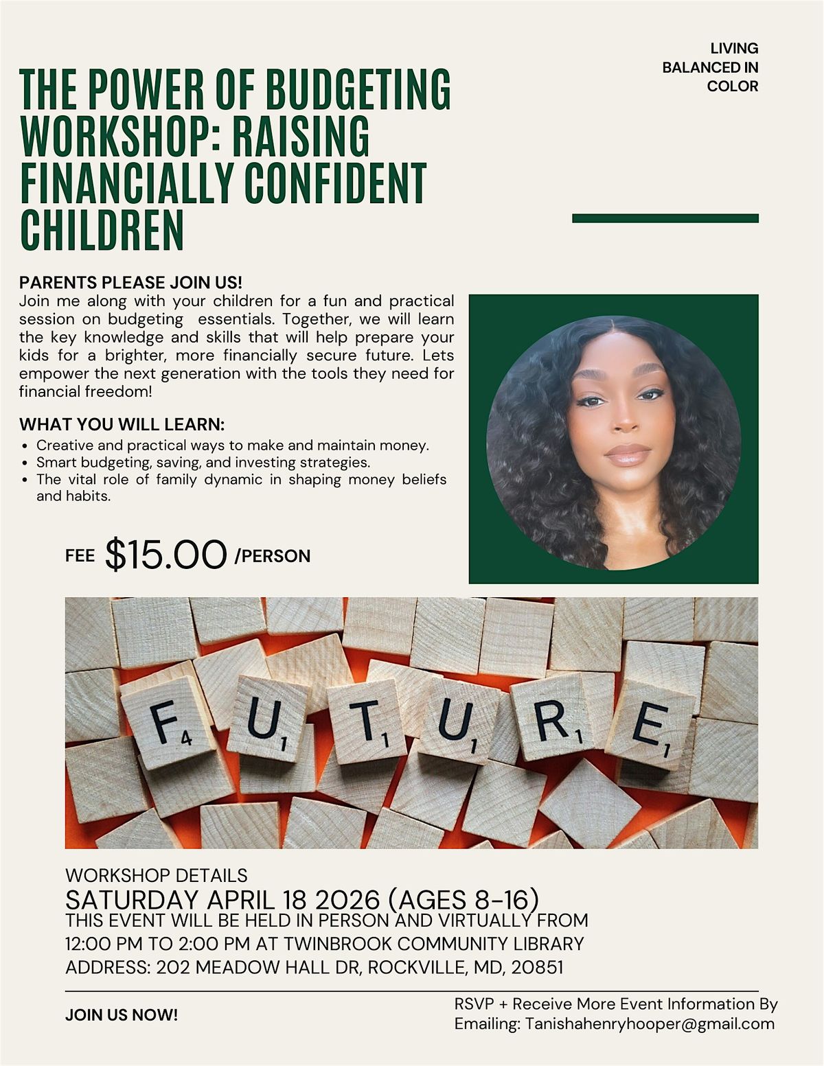 Join us in person for a fun and interactive workshop designed to help you teach your kids the value of money and smart budgeting! Discover simple tips and creative ways to raise children who feel confident managing their finances from an early age. Bring your questions and get ready for an inspiring session that empowers your family’s financial future!