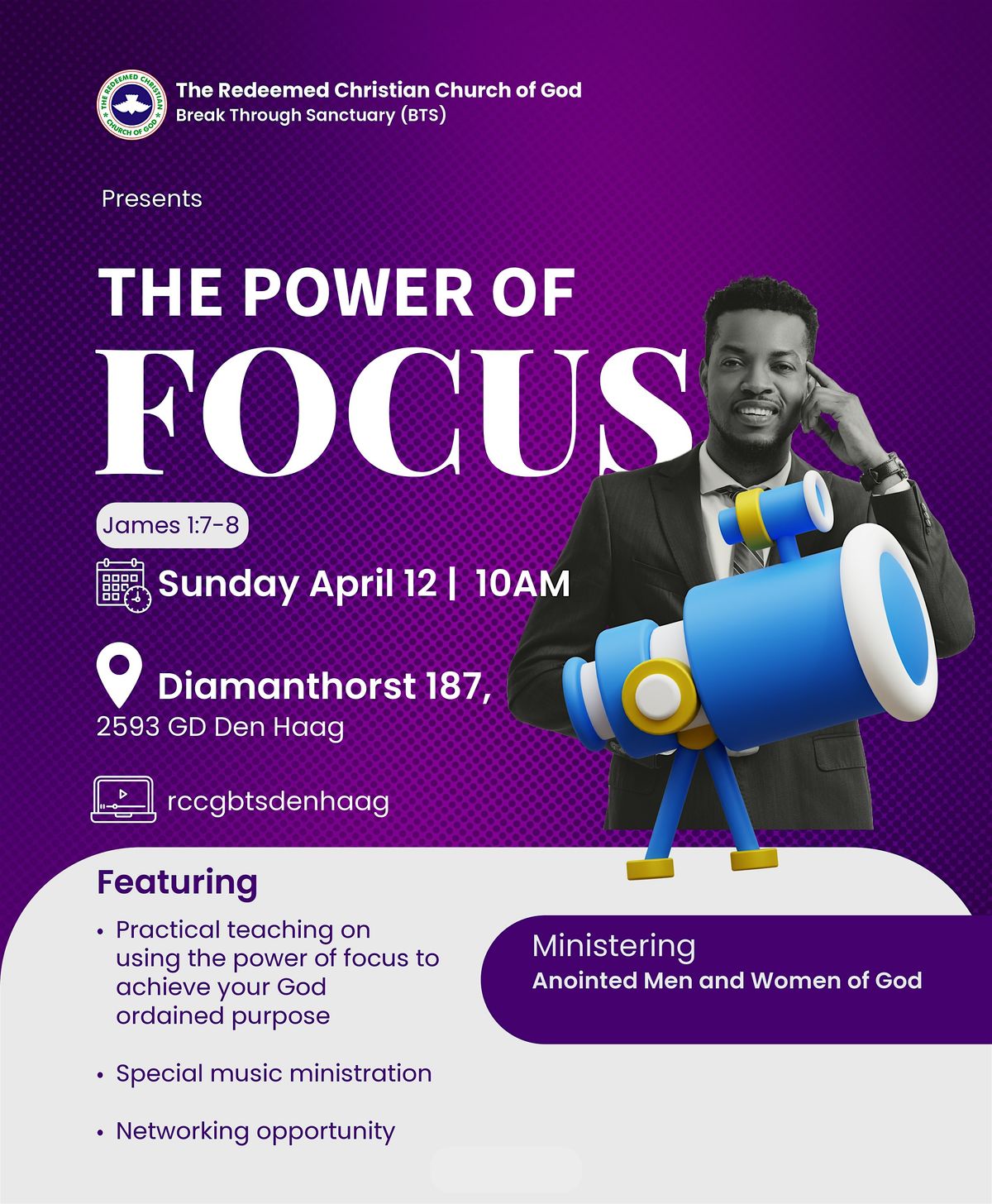 The Redeemed Christian Church of God (RCCG) Breakthrough Sanctuary (BTS) invites you to a transformative meeting titled βThe Power of Focus,β anchored in James 1:7-8 on April 12, 2026, in Den Haag.