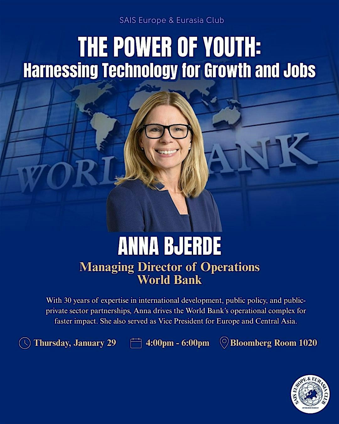 Please join the SAIS Europe and Eurasia Club in welcoming Anna Bjerde, Managing Director of Operations at the World Bank Group, for a discussion on the future of jobs and economic growth as the institution adapts to a rapidly evolving global landscape shaped by emerging technologies. The conversation will be moderated by the club’s leadership, and attendees will have the opportunity to participate in a Q&A with Ms. Bjerde.