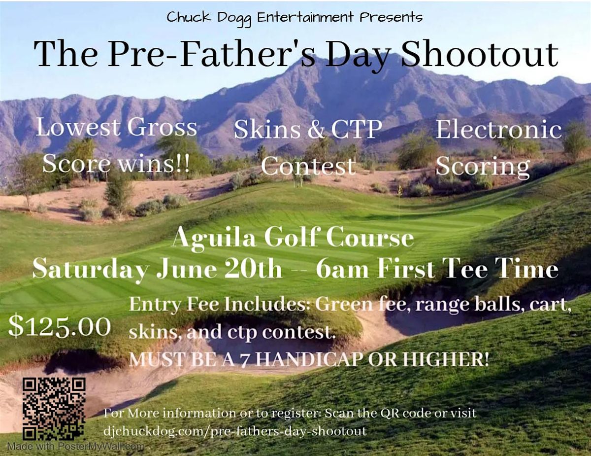 If your handicap is 5 or higher, you’re in! Chuck Dogg created this event to bring together golfers within the same ability range, making it a true test of skill. If you think you’ve got what it takes to beat 39 other golfers just like you, bring your game and let’s find out who’s really got it.Join us at Aguila Golf Course on Saturday, June 20, 2026 (Father’s Day Eve) with first tee time at 6:00 AM. Entry is $124 ($64 green fee + $60 tournament buy-in).A non-refundable $10 confirmation fee secures your spot and is applied toward your total. Send via Zelle or Cash App to Chuck Dogg Entertainment at 773-419-8840, or use Eventbrite (small surcharge applies).Limited to the first 40 players that pay their confirmation fee.