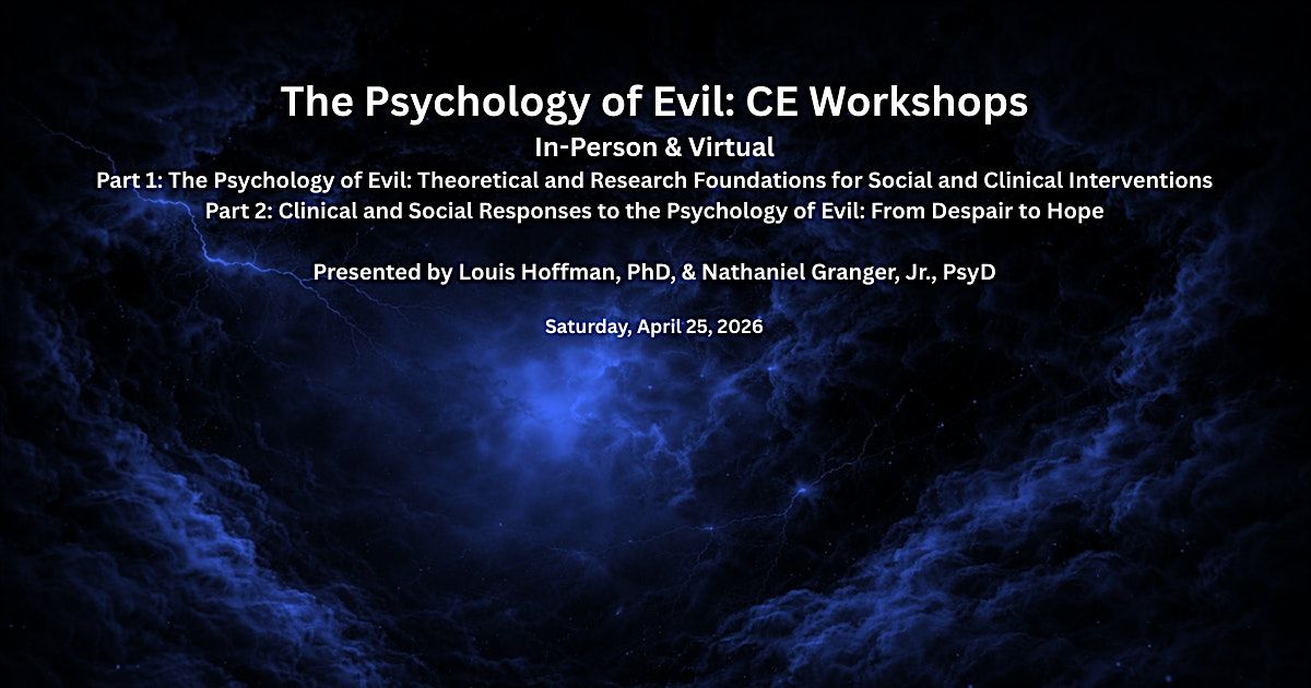 This 2-part workshop considers existential-humanistic perspectives on the psychology of evil. The morning workshop defines evil and considers why this topic is so important in contemporary times. Following a brief overview of the history of the concept of evil, three existential perspectives are considered along with social psychological perspectives. In the afternoon, the workshop considers misuses of the concept of evil in psychology and society. Building on the morning theoretical foundations, Drs. Hoffman and Granger discuss philosophically and research-informed existential responses to the problem of evil. These responses provide a path to hope.
