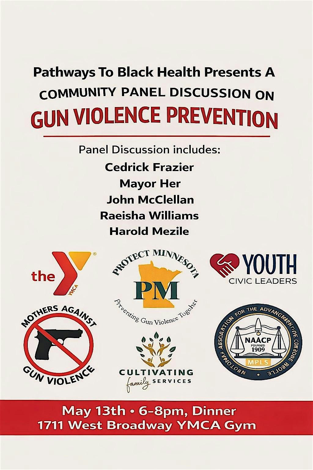 Join us at the Harold Mezile North Community YMCA on May 13, 2026 at 6:00 PM (Central Time) for an open dialogue about the psychology behind gun violence. This is a great chance to break bread (dinner will be served) and connect with neighbors, share thoughts, and explore ways to make our community safer together. Everyone’s voice matters, so come as you are and be part of the conversation! Panel Discussion includes: Cedrick Frazier, Mayor Her, John McClellan, Raeisha Williams and Harold Mezile.