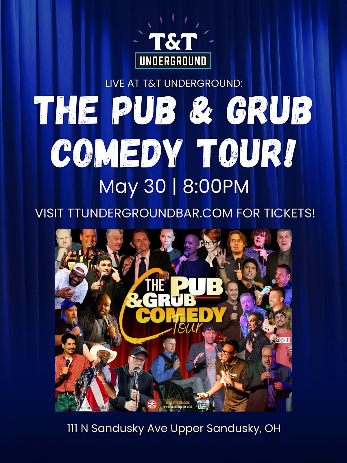 Tell your friends, grab your seats, and come experience an unforgettable night of comedy at The Pub & Grub Comedy Tourโlive at T&T Underground in Upper Sandusky, Ohio!