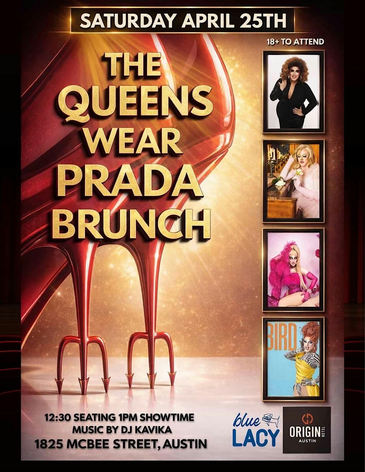 Get ready to sashay and serve looks April Drag Brunch, where our favorite divas are in Prada! Join us for a fabulous day full of lip-syncs, laughs, and gorgeous glam. Enjoy the in-person vibes as queens bring the drama and charm you love. Whether you’re brunching with friends or flying solo, this is the place to be to celebrate all things bold and beautiful. Don’t miss out on the fun and fierce energy—see you there!