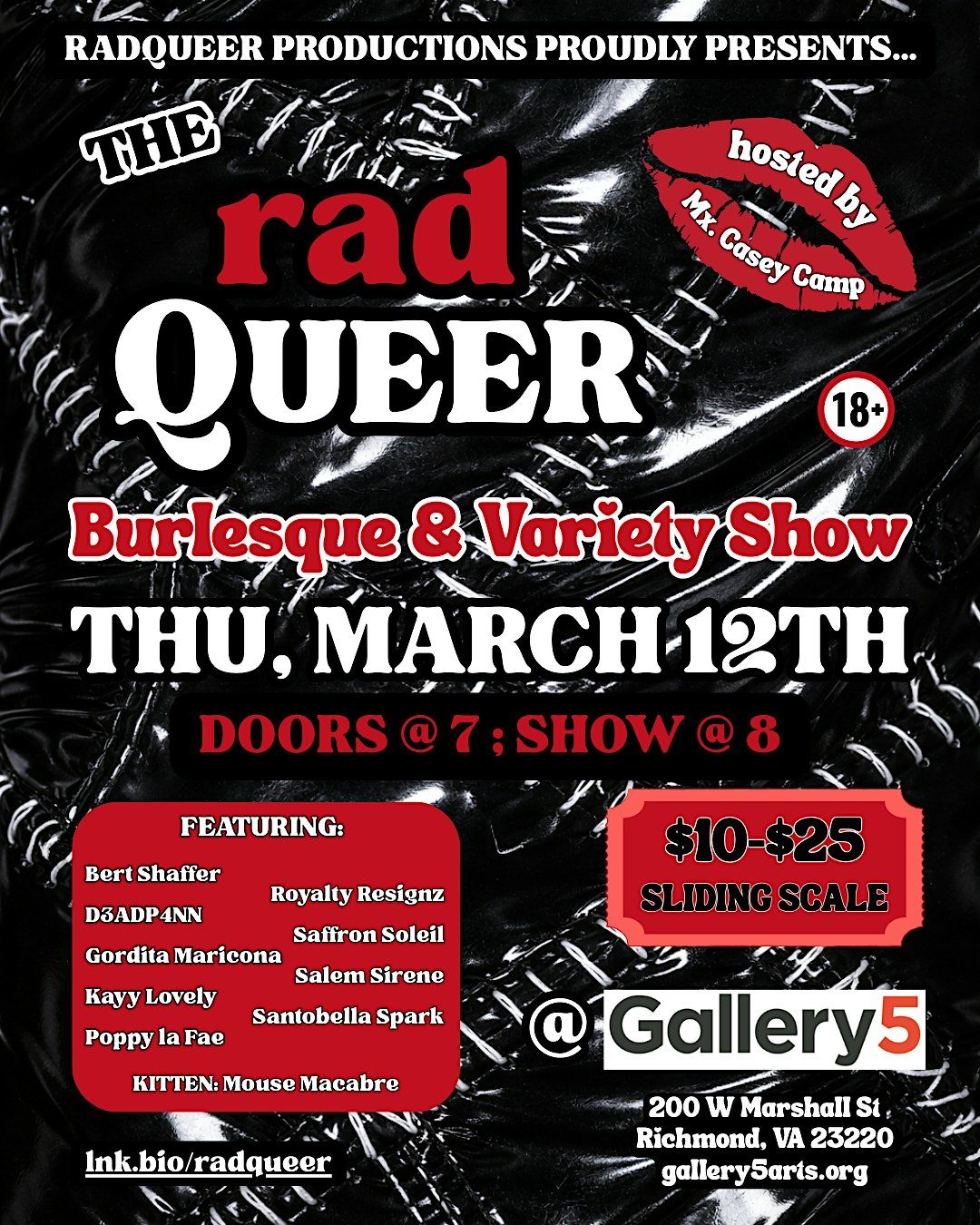 RadQueer Productions proudly presents our inaugural event…The RadQueer Burlesque & Variety Show! It’s a celebration of the rad and the radical, the queer and the questioning, the sexy and the subversive. A burlesque and variety show for rad queers and the people who love us. We’re bringing you some of the most exciting LGBTQ+ performers that Richmond has on tap, so get your tickets now before they’re all sold out!