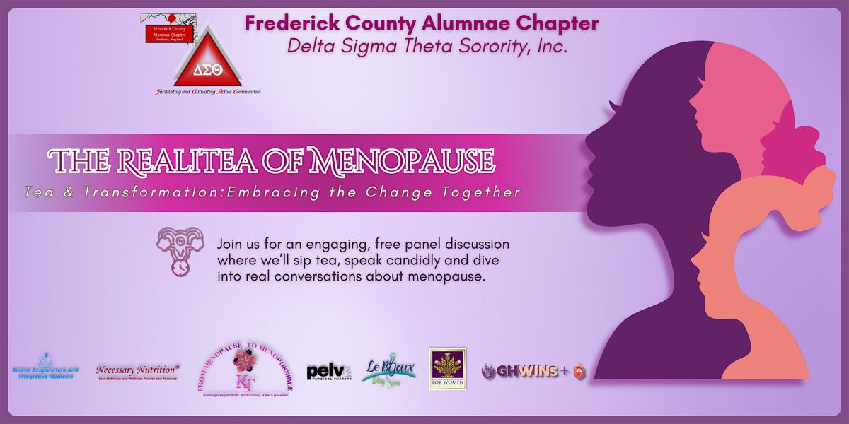 Join the Frederick County Alumnae Chapter of Delta Sigma Theta Sorority, Inc., for our 2nd RealiTea of Menopause event, featuring a powerful, transformative, and candid panel discussion centered on MENOPAUSE.