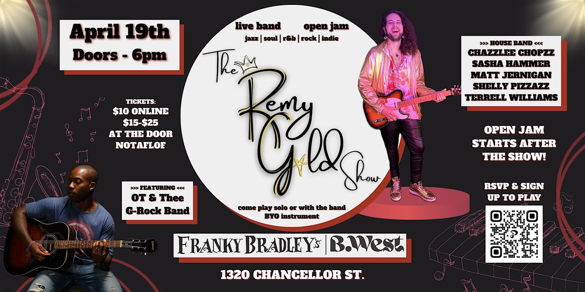 The Remy Gold Show is back at Franky Bradley’s | B. West on April 19th! This new show spotlighting original music and featuring a live house band is half concert, half open jam. Come for the show, stay for the jam. Bring your instruments, bring your voice, and join us for the gold vibe.