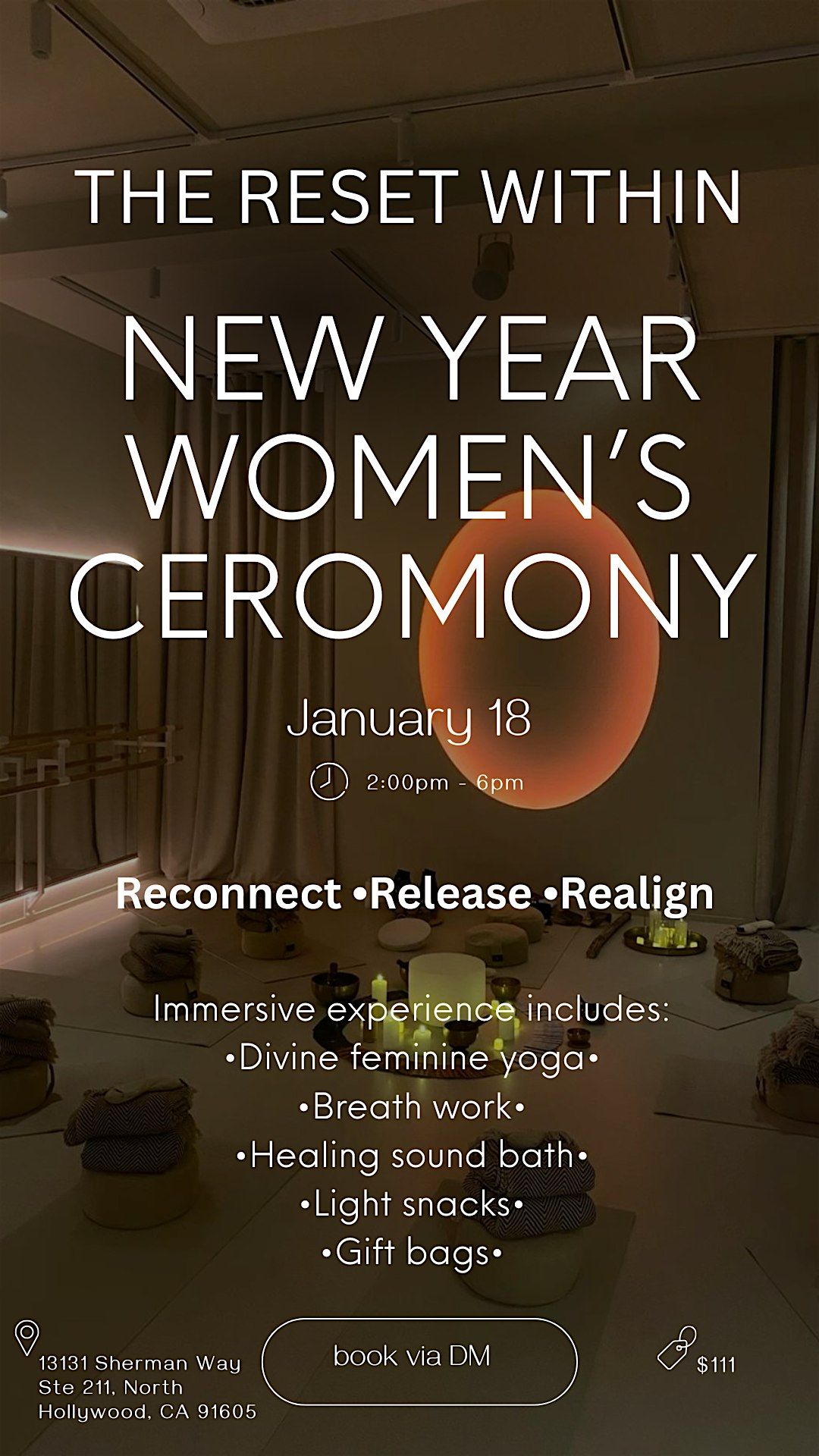 The Reset Within is a guided women’s healing experience designed to support nervous system regulation, emotional release, and embodied clarity. This New Year women’s ceremony in North Hollywood blends somatic practices, breathwork, and sound healing to help you reconnect with your body and realign for the year ahead.