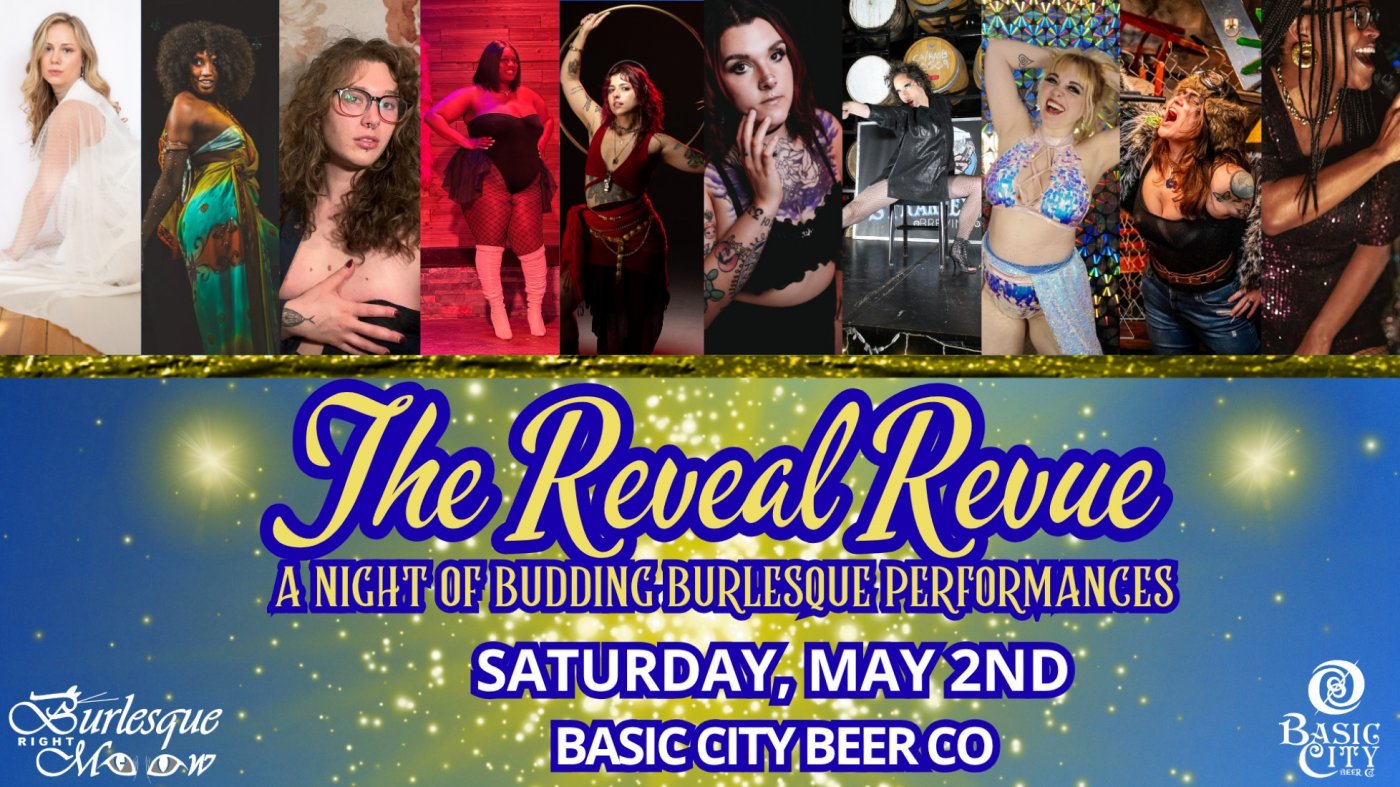 On May 2nd, the Reveal Revue lands back at Basic City Beer Co. for a night of rising talent and new growth on stage. We’re celebrating the season of discovery with a showcase of up and coming performers and veterans debuting their latest works. Join us for a night of captivating burlesque and variety!