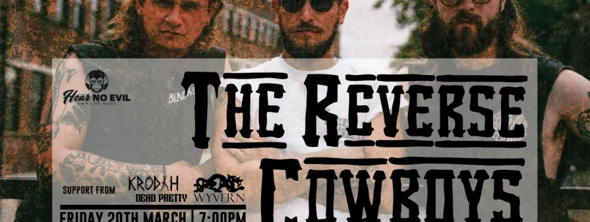 All guns blazing 3 piece punk outfit hailing from the Norfolk badlands. Serving up deep fried bangers with an electric stage presence on Friday 20th March.THE LOUD. THE DRUNK. AND THE GOD DAMN COWBOYS.The Reverse Cowboys sit somewhere between punk and hard rock. 2 singles are currently available on all online streaming platforms and more to come very soon. Keep them peepers PEELED.Support on the night comes from Krodah, Wyvern & Dead Pretty!Doors open at 7:00 PM, Tickets £10 + booking fee Please note that access to the top floor of Three Wise Monkeys does not have a lift, but there are rest opportunities between each flight of stairs.Viewer discretion is advised: This show may potentially contain flashing and strobing lighting effects.We wanted to inform you of our refund policy regarding event tickets. Please note that we will be unable to process any ticket refunds within 7 days of the event.We understand that circumstances may arise that prevent you from attending the event, but unfortunately, we are unable to accommodate refund requests within this timeframe.