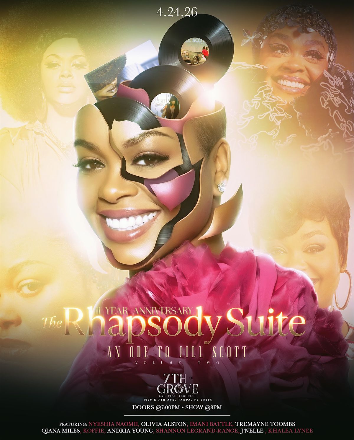 The Rhasody Suite turns 11 this April and what better way to celebrate than taking it back to our first theme all those years ago, An Ode To Jill Scott. With the release of her first album in ten years, we feel it's only right to revist and touch on her musical catalog to make this celebration golden. Featuring a line up of 10 phenomenal women, this will be a night to remember. You do not want to miss this! The Rhapsody Suite is staple in live music in FL and this show will be another one for the books. If you love live music, soul music, rnb music...this is the place to be.