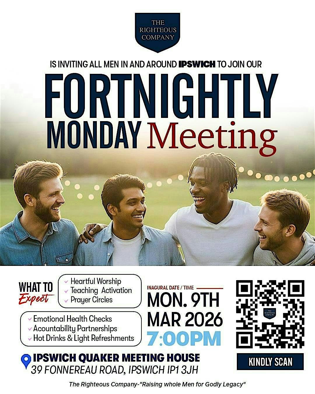 Welcome to The Righteous Company-The Gathering of Men event! Join us at the Quaker Meeting House on March 9, 2026 at 7:00 PM for an evening of camaraderie and empowerment. This gathering is a unique opportunity for men to come together, share experiences, and support each other on their journeys. Don't miss out on this chance to connect with like-minded men and be inspired! See you there!