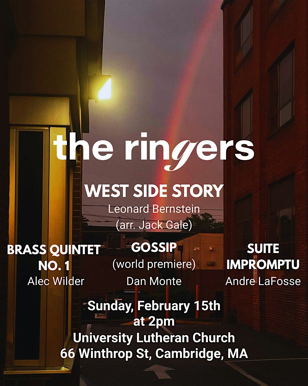 Hear the music of Leonard Bernstein's West Side Story performed by The Ringers Brass! Also highlighted in this concert is a world premiere of local composer Dan Monte's new work Gossip written specifically for the ensemble!