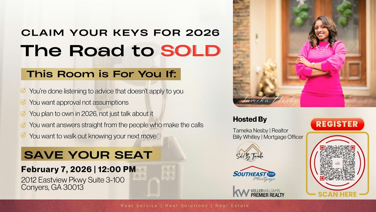 Welcome to The Road to SOLD! Homebuyer Seminar, taking place on February 7, 2026, at 12:00 PM (ET) at 2012 Eastview Pkwy Conyers, GA 30013.
