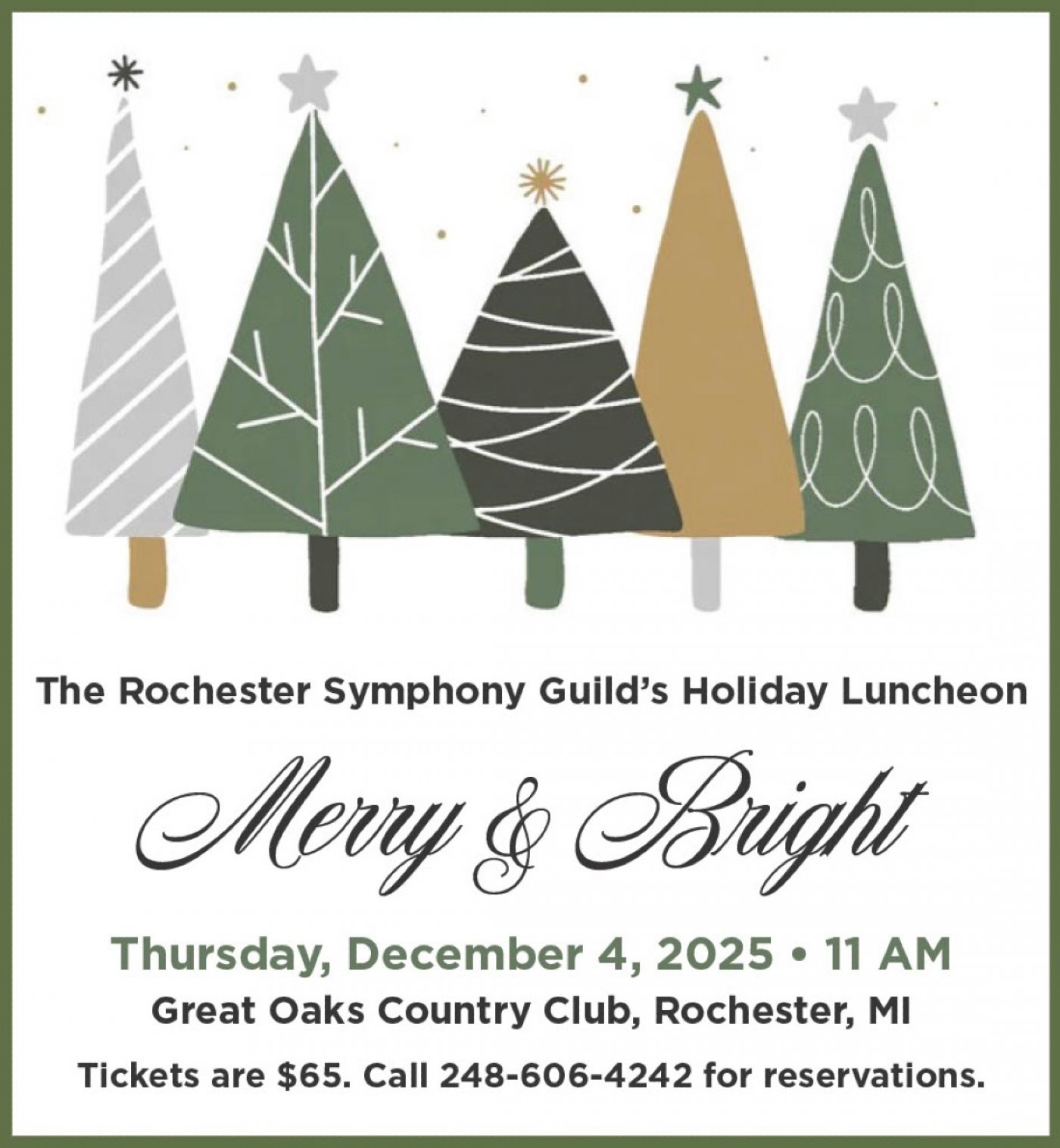 Experience the joy of the season at the Rochester Symphony Guild’s Annual Holiday Luncheon set in the elegant Great Oaks Country Club at 777 Great Oaks Boulevard Rochester Michigan.
