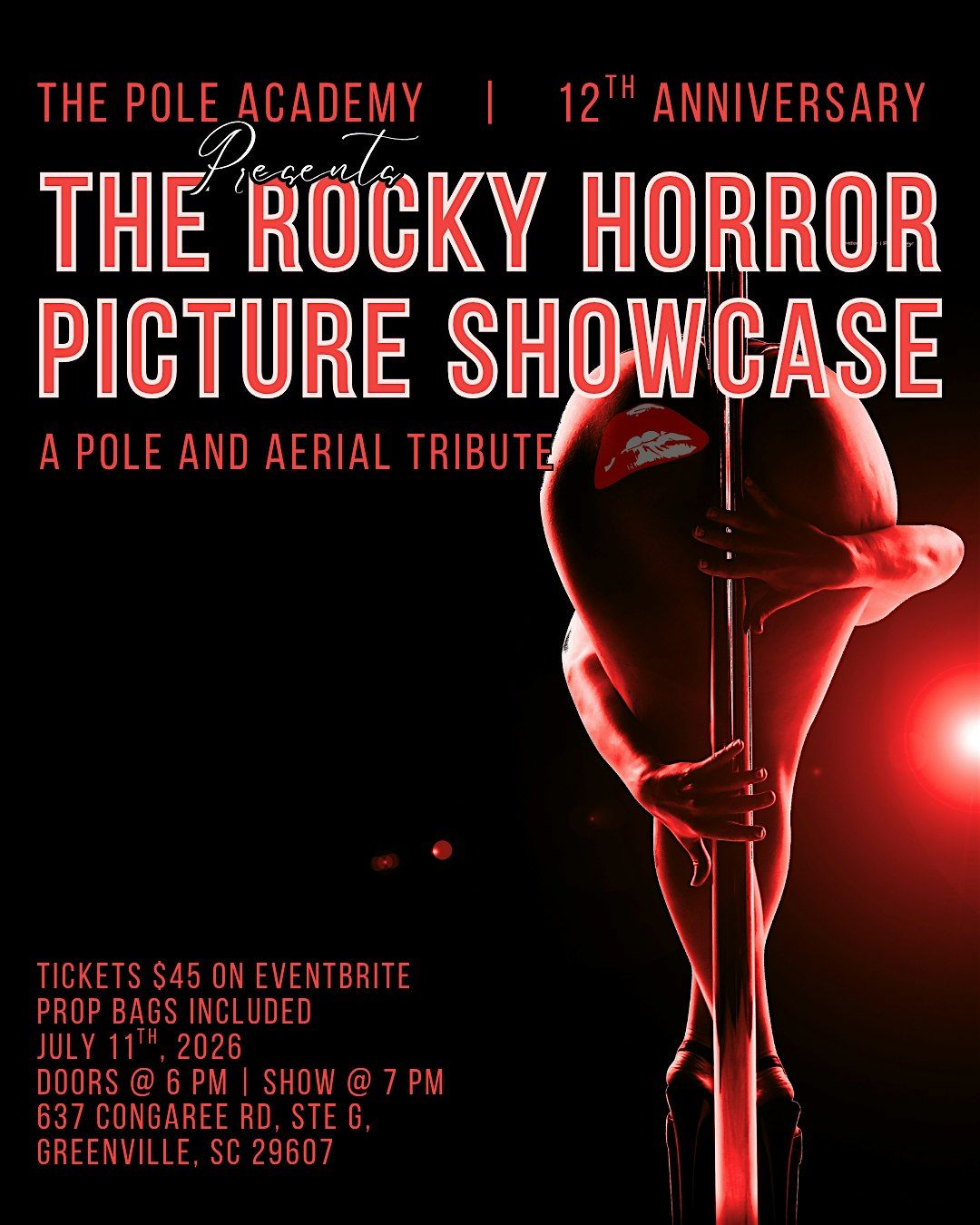Join The Pole Academy in celebrating their 12th anniversary with The Rocky Horror Picture Showcase! A pole and aerial tribute to the cult classic described at its original 1975 release as "campy trash" and a "tedious mess", this will be a night to give yourself over to absolute pleasure. Our incredible student and instructor performances will make you shiver with antici...pation.