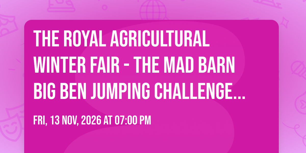 🎉 Welcome to The Royal Agricultural Winter Fair - The Mad Barn Big Ben Jumping Challenge at Coca-Cola Coliseum, where dreams come alive and possibilities are endless! 🏛️ Join us at Coca-Cola Coliseum in the heart of Toronto, ON for an event that defies expectations. 📅 On November 13th, 2026 at 07:00 PM, be part of something truly extraordinary as we bring together innovation, entertainment, and pure magic. ✨ Every aspect has been carefully designed to ensure an unforgettable experience for all our guests. Whether you're seeking adventure, inspiration, or simply a break from the ordinary, this event promises to deliver beyond your wildest dreams. 🎊 Prepare for a journey into the extraordinary!