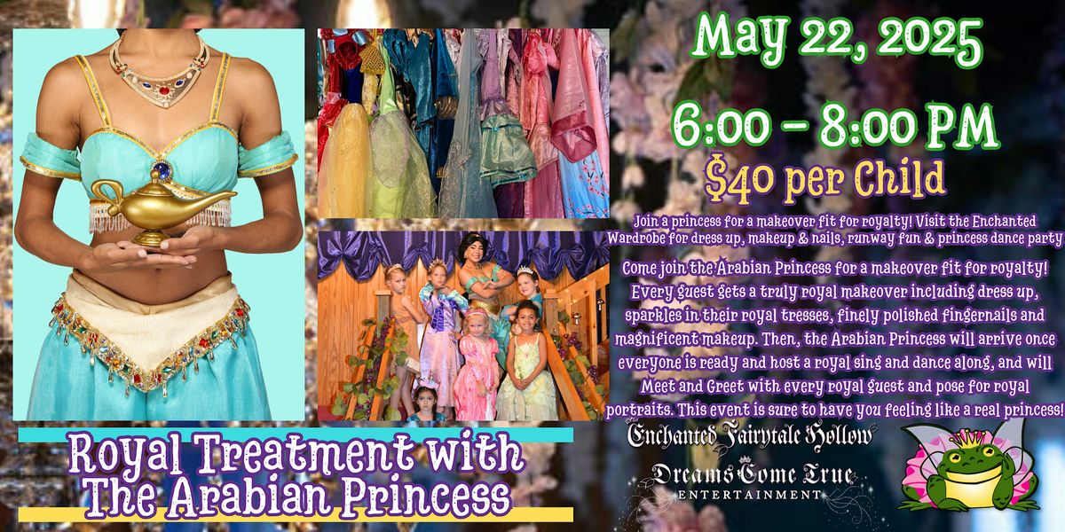Come join the Arabian Princess for a makeover fit for royalty! Every guest gets a truly royal makeover including dress up, sparkles in their royal tresses, finely polished fingernails and magnificent makeup. Then, the Arabian Princess will arrive once everyone is ready and host a royal sing and dance along, and will Meet and Greet with every royal guest and pose for royal portraits. This event is sure to have you feeling like a real princess!