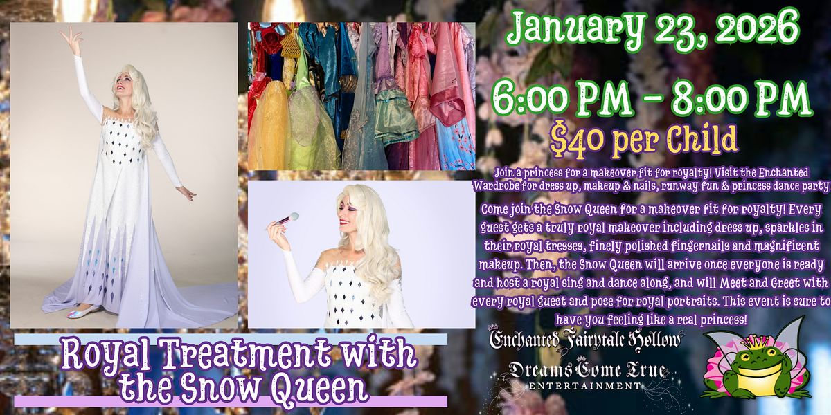 Come join the Snow Queen for a makeover fit for royalty! Every guest gets a truly royal makeover including dress up, sparkles in their royal tresses, finely polished fingernails and magnificent makeup. Then, the Snow Queen will arrive once everyone is ready and host a royal sing and dance along, and will Meet and Greet with every royal guest and pose for royal portraits. This event is sure to have you feeling like a real princess!