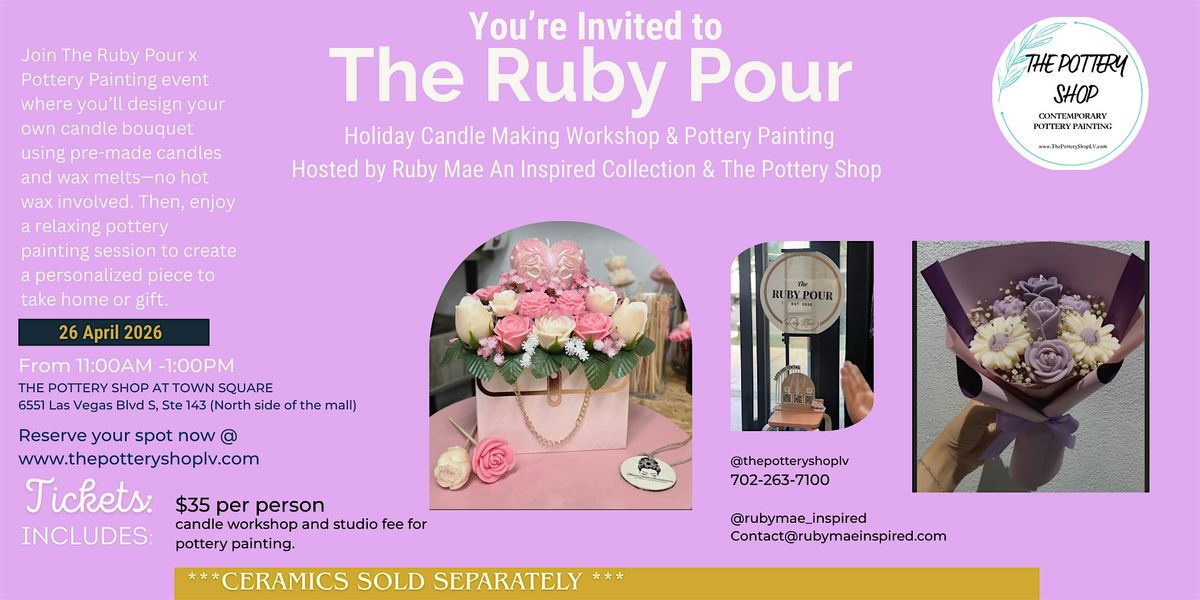 Join us for a special Ruby Pour x Pottery Painting event where guests will design their own candle bouquet using pre-made candles and wax melts. No hot wax involved. Simply choose your pieces and arrange them into a stunning, floral-inspired display