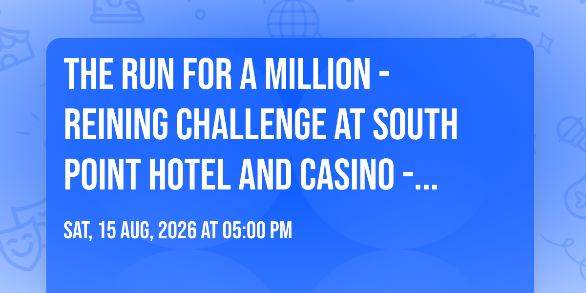🎉 Welcome to The Run for a Million - Reining Challenge at South Point Hotel and Casino - South Point Arena, where dreams come alive and possibilities are endless! 🏛️ Join us at South Point Hotel and Casino - South Point Arena in the heart of Las Vegas, NV for an event that defies expectations. 📅 On August 15th, 2026 at 06:00 PM, be part of something truly extraordinary as we bring together innovation, entertainment, and pure magic. ✨ Every aspect has been carefully designed to ensure an unforgettable experience for all our guests. Whether you're seeking adventure, inspiration, or simply a break from the ordinary, this event promises to deliver beyond your wildest dreams. 🎊 Prepare for a journey into the extraordinary!