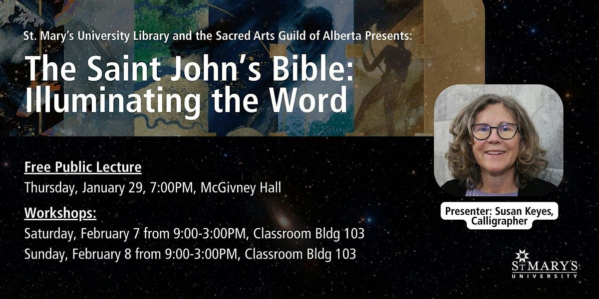 Join calligrapher, Susan Keyes, as she dives into the artistry and spiritual significance of The Saint John's Bible Heritage Edition. This collaborative event hosted by the Sacred Arts Guild of Alberta and St. Mary's University will focus on the sacred tradition of illlumination and its contemporary relevance, fostering engagement with one of St. Mary's most treasured works.