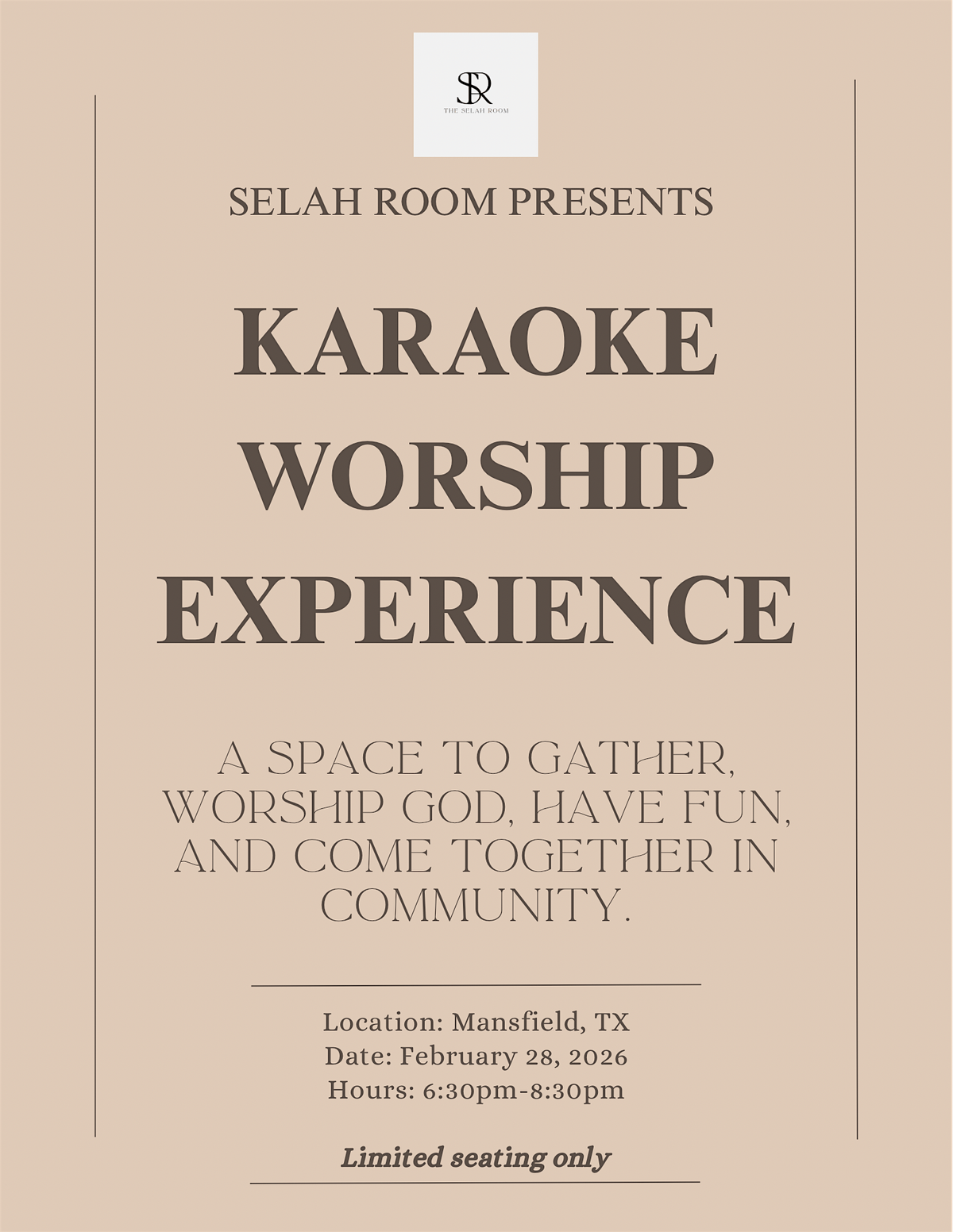 Come ready for worship-filled karaoke, genuine connection, and a peaceful evening designed to help you reset and refocus.
