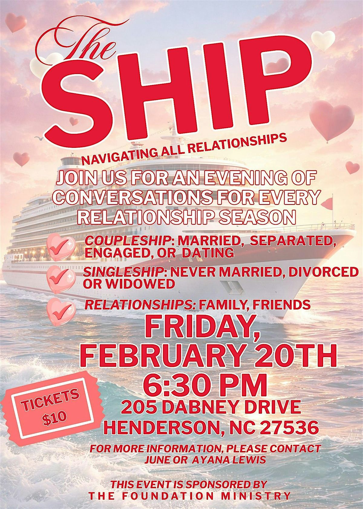 Set sail with us for The Ship-Navigating Relationships, an in-person event where we dive deep into the waves of connection and communication. Whether you're looking to strengthen bonds or just curious about the tides of relationship dynamics, this is the place to be. Bring your crew or come solo, and let's chart a course to better understanding together!