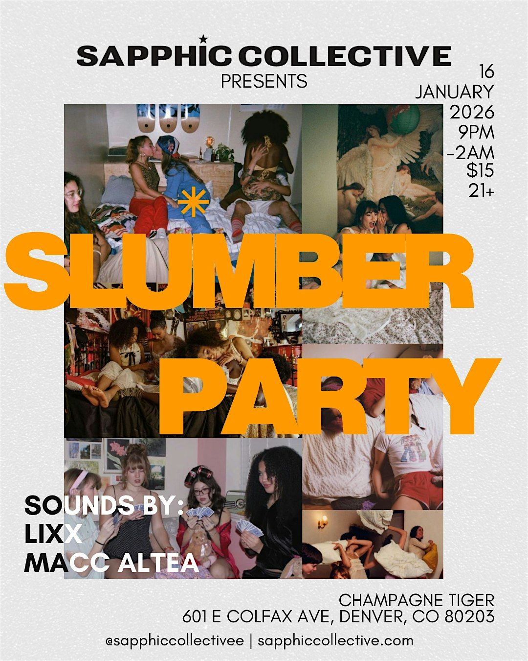 Sapphic Collective is hosting a slumber party themed event at Champagne Tiger from 9pm-2am. There will be a drag show with Iman, La Diabla, Miss Jewdy, and Zimmorah Mei. The DJs are LIXX and MACC ALTEA! Come dance in your PJs! This event is 21+