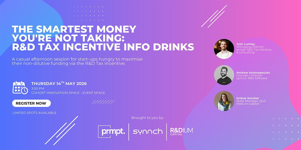 Join us for "The Smartest Money You're Not Taking: R&D Tax Incentive” a relaxed and engaging lunch event co-hosted by prmpt. and Synnch, in collaboration with Cohort Innovation Space.
