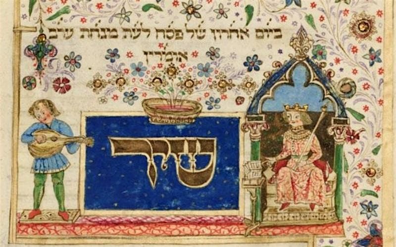 Image: Illustration for the first verse of the Song of Songs, a minstrel playing before Solomon (15th century Rothschild Mahzor, Manuscript, Italy, 1490., Public domain, via Wikimedia Commons)