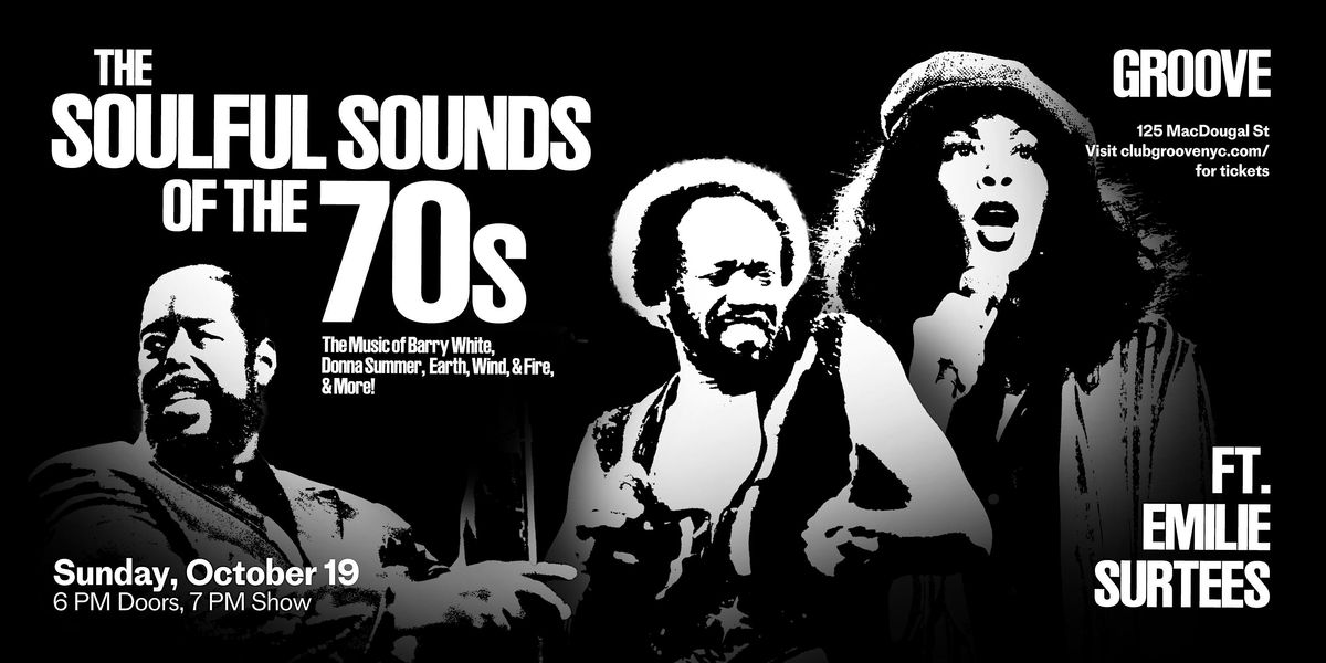 The ONLY Place You'll Want To Be On Sunday, October 19th @ 7:00PM Is At Groove New York On MacDougal Street Where Emilie Surtees & The Stage Revolution Band Will be Performing A Musical Tribute To The Celestial Soulful Sounds of The 70s! You'll Hear Sum Of The BIGGEST HITS By Donna Summer, Barry White, Gloria Gaynor, Stevie Wonder, Earth, Wind, & Fire, & So Much More!!!Scrumptious Food & Your Favorite Drinks Will Be A Plenty & You Can Be SURE This Show Will Be FIYAH!!! So Grab Sum Peeps! Dress Your 70s BEST! & Come Have A Great Time!