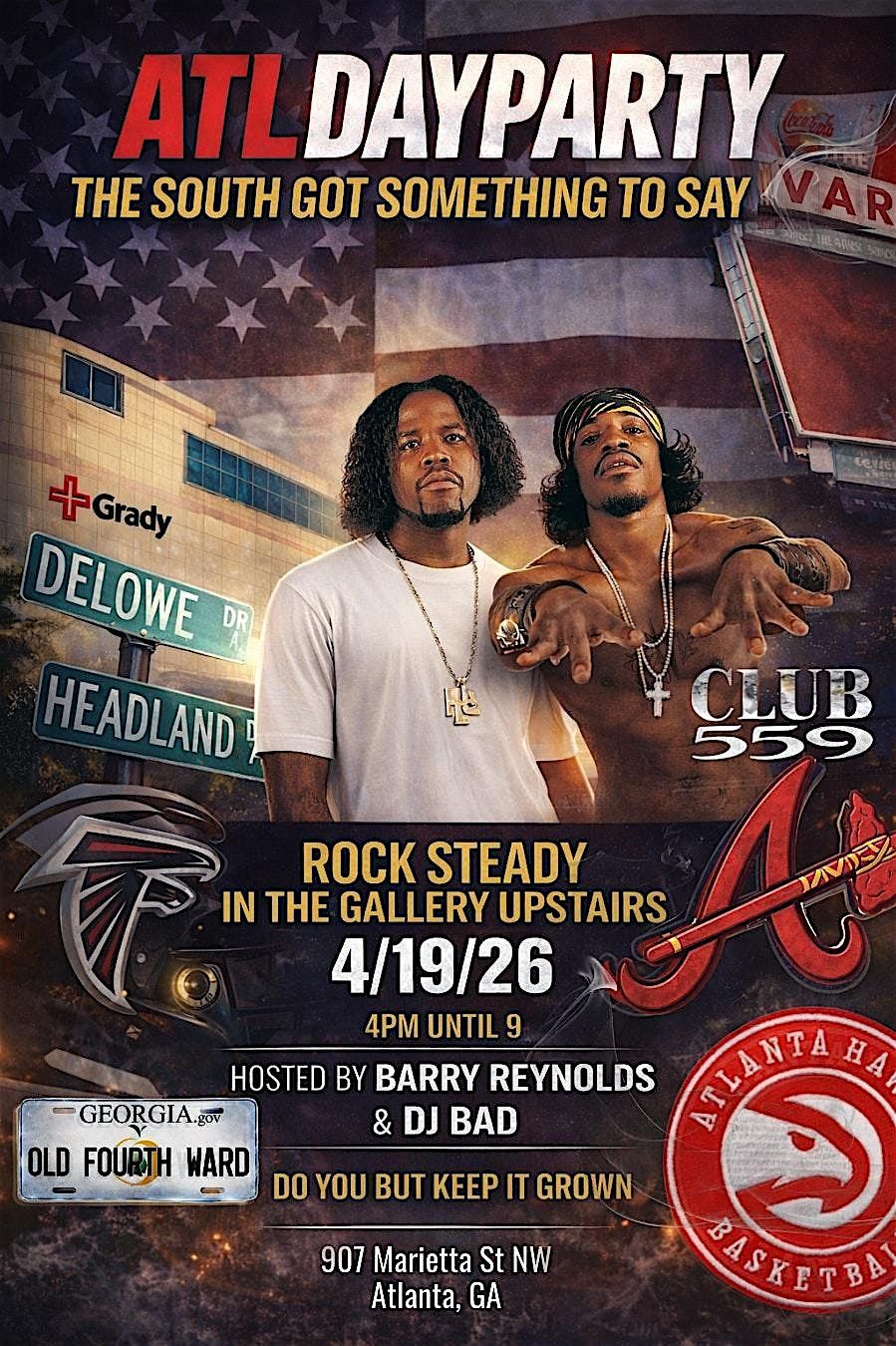Welcome to The South Got Something To Say (ATL Day Party) at Rock Steady - Atlanta! Get ready for a day filled with good vibes, great music, and amazing company. Join us on April 19, 2026 at 4:00 PM (Eastern Time) for an unforgettable experience. Let's celebrate the ATL culture in style! See you there! Let's bring back that party experience of clubs like 559, 112, Charles Disco, Atlanta Live, Vegas Nights, Frozen Palace, & Central Station. Let's party and dance from Southern hits by Kilo, Eightball & MJG, Luke, Outkast, Goodie Mob, Raheem The Dream, & Poison Clan just to name a few.