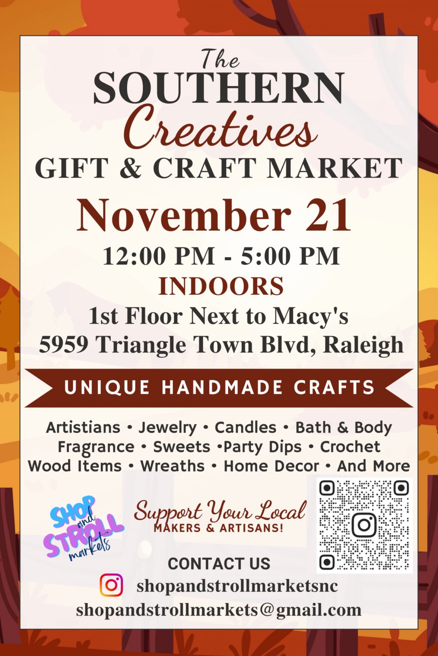 The Southern Creatives Gift & Craft Market is a vibrant indoor shopping event celebrating local makers and artisans. Held on November 21 from 12:00 PM to 5:00 PM, this market takes place on the 1st floor next to Macy’s at 5959 Triangle Town Blvd in Raleigh.
