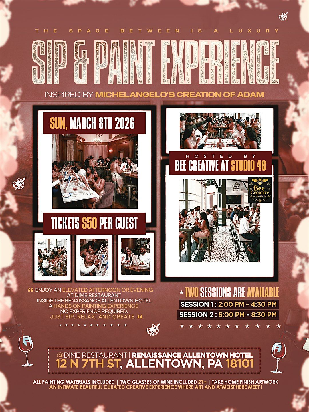 Join us inside Dime Restaurant at the Renaissance Allentown Hotel for an elevated sip & paint designed to explore connection, movement, and personal expression through a hands-only painting technique. No painting experience is required — guests can simply sip, relax, and create.