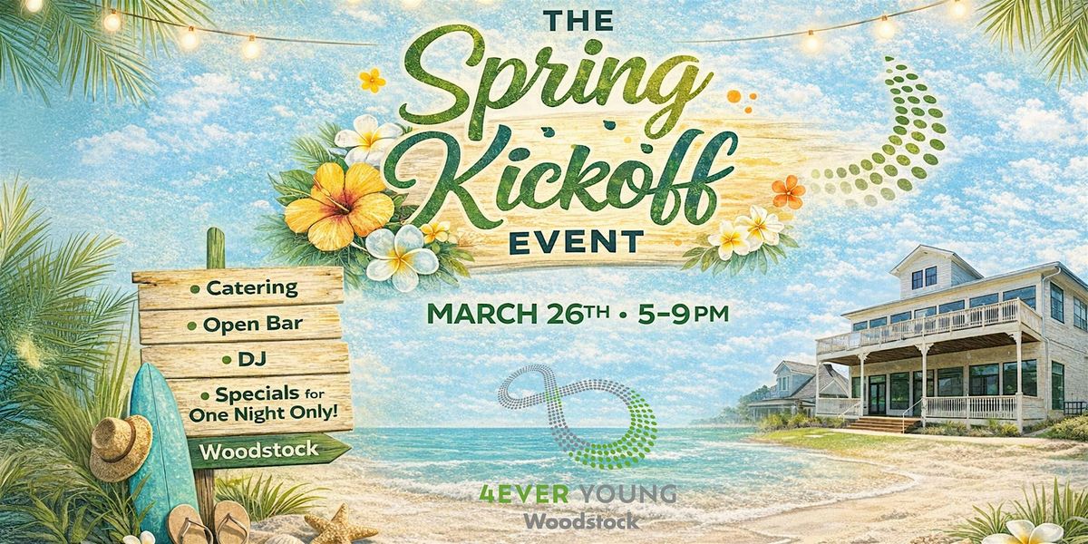 Kick off spring with us at 4Ever Young Woodstock’s Spring Kickoff Event on March 26th from 5–9 PM! 🌸 Join us for an evening of celebration featuring catering, an open bar, a DJ, and exclusive one-night-only specials you won’t want to miss.