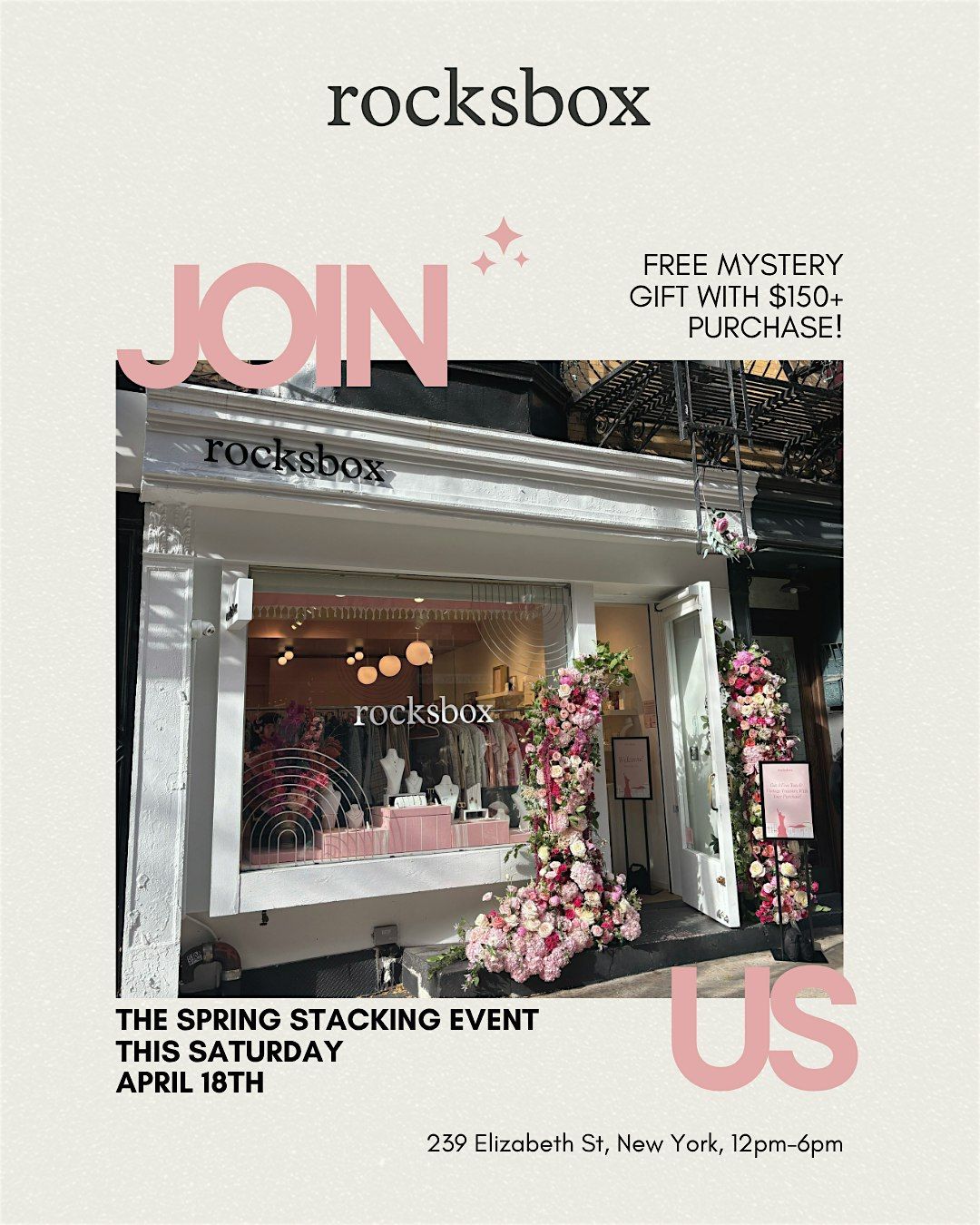 Join us for a day to build your spring stack in-store. All day, get a free mystery jewelry gift with any purchase over $150. Plus, we’ll have refreshments, such as matcha, on-site!