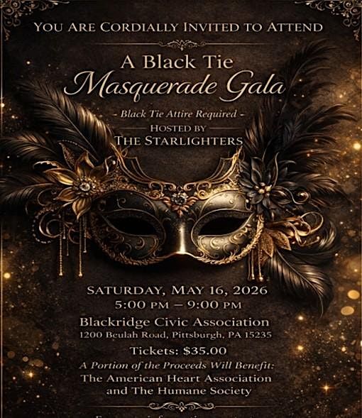 Get ready for a night of mystery and glamour at The Starlighters' Black Tie Masquerade Gala! Dress to impress in your finest evening wear and don a fancy mask to keep things intriguing. This is an in-person event where you can mingle, dance, and enjoy an unforgettable evening surrounded by stylish folks. Don't miss out on this elegant party packed with fun and surprises!