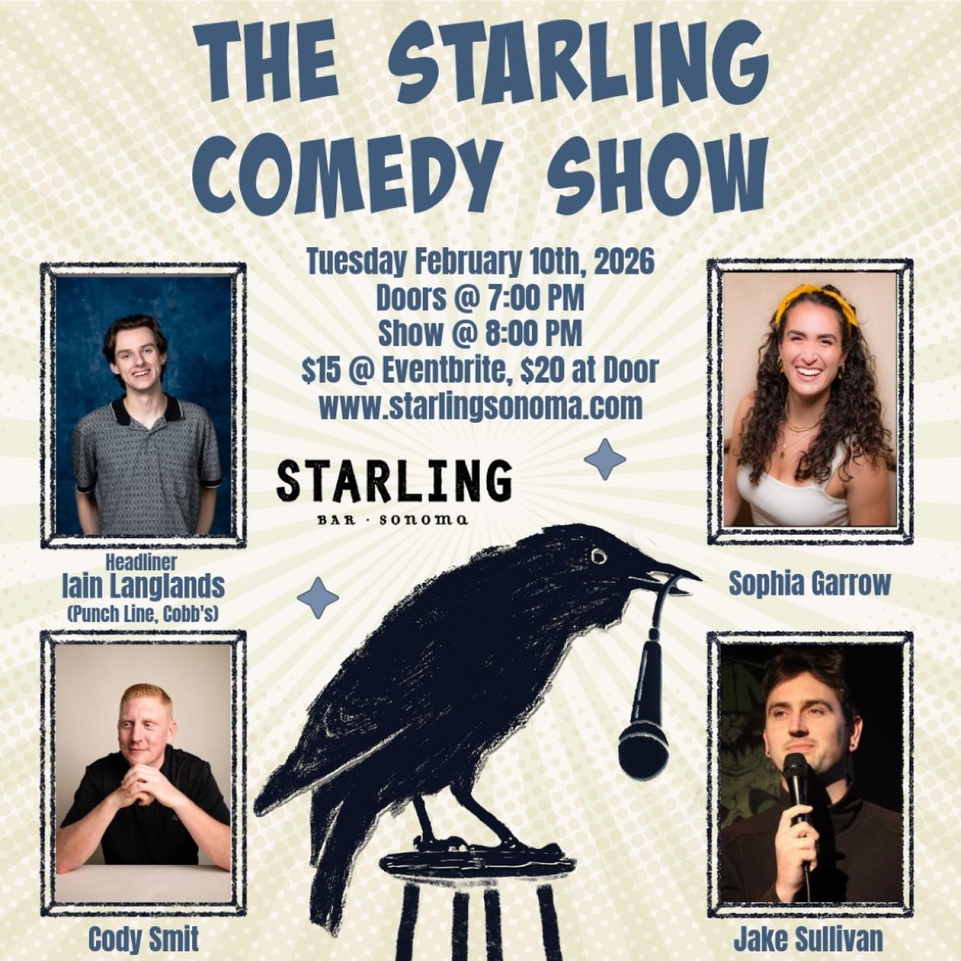 The Starling Comedy Show is back!!! Come on out to Starling Bar in Sonoma! You won't find a better line up of comedians on a Tuesday night anywhere in the Bay Area!