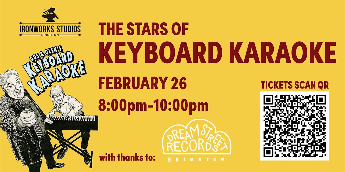 Gus and Glen's Keyboard Karaoke at the Ironworks for the first time. We will be in the Cabaret area next to the bar. We aim to create super concentrated nights of passion and surprise with our community of singers. We promise memorable moments acompanied by the incredible Glen Richardson on keys. 250 songs to choose from on our list. Not a singer? No problem, there's song bingo cards. It's fun and more deeply than that it's also fun. Dressing up outrageously is encouraged. Thanks to Rasheed at Dreamstreet Records for your support.