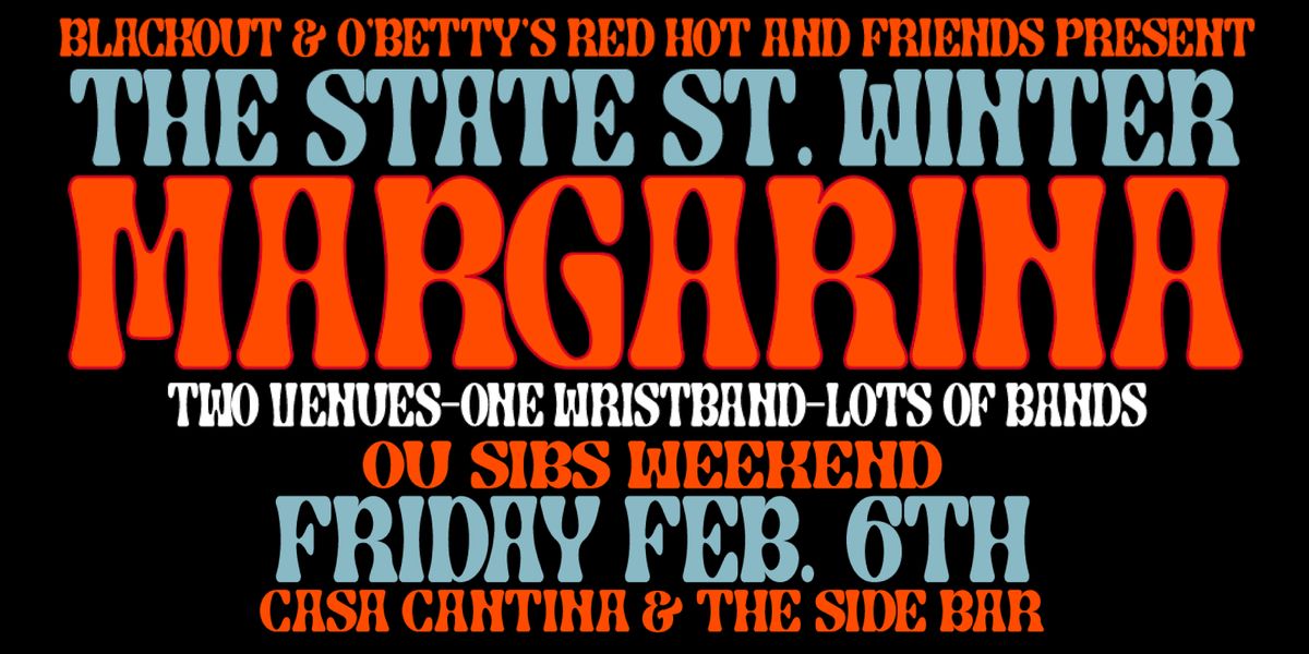 Blackout & Friends present the State Street Margarina! Two venues, one wristband! The Side Bar stage (24 East State St.) will be starting 8pm, and the Casa Cantina (6 West State Street) will start music at 9:30pm. Purchase an all-access pass or simply choose one venue. It's OU Sibs weekend - don't forget to bring yours! We hope to see you there!