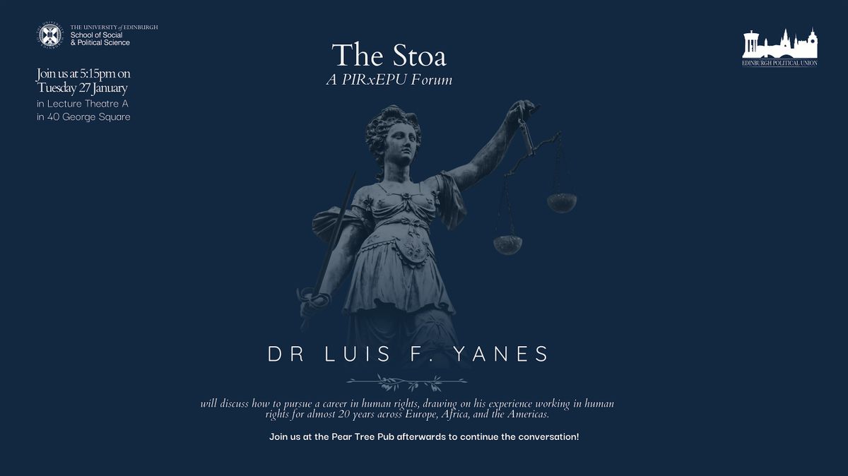 Join us for the second Stoa event of Semester 2. We'll be joined by Dr Luis F. Yanes, a guest lecturer in International Human Rights and the Scottish Commission on Human Rights' expert on economic, social and cultural rights.