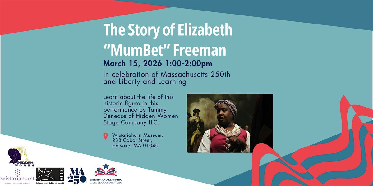 Immerse yourself in the story of Elizabeth “MumBet” Freeman and learn how she made history. Join Tammy Denease of Hidden Women Stage Company on Sunday, March 15th, 2026 from 1:00-2:00pm at Wistariahurst Museum. Tickets will be available on Wistariahurst’s Eventbrite page. Sliding scale admission is offered for this event, with tickets ranging from $0 - $15. This program is funded in part by a grant from the Holyoke Local Cultural Council, a local agency which is supported by the Mass Cultural Council, a state agency.