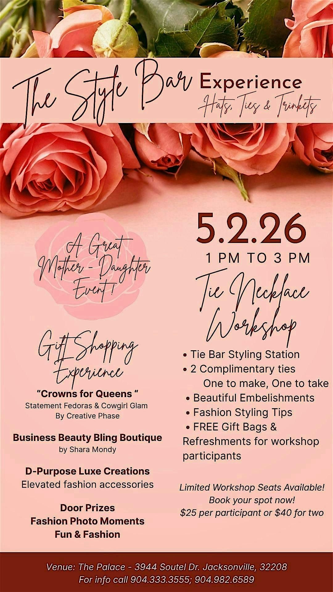The Tie Necklace workshop kit comes with (2) Complimentary Ties (One to Style, and One to Take home) you will have a bling station to choose beautiful jewels and embelishments *Fashion Styling Tips *Light Bites/refreshments for each paid workshop participant.