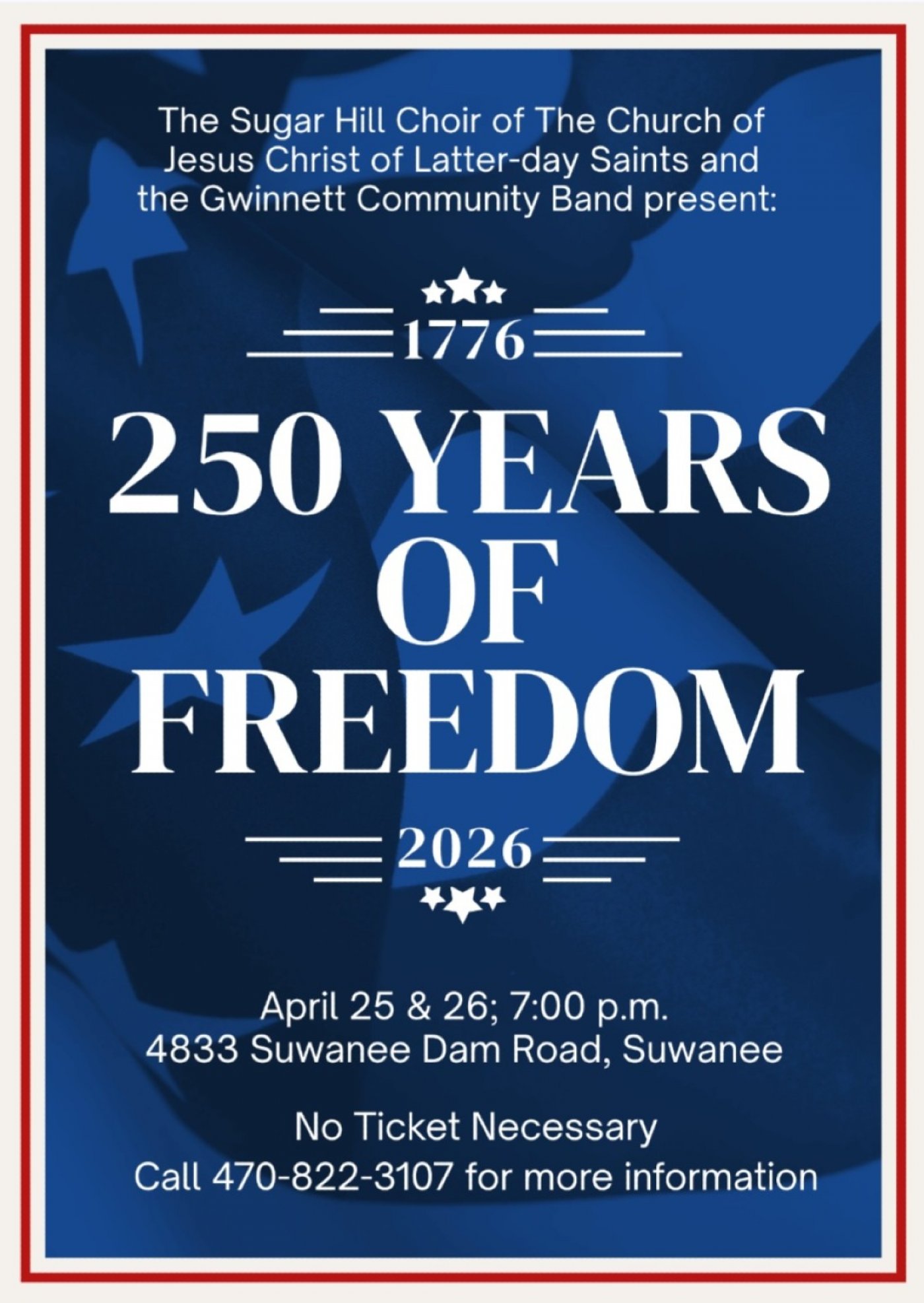 The Sugar Hill Choir of The Church of Jesus Christ of Latter-day Saints and the Gwinnett Community Band present a historic concert on April 25 and 26. Themed 250 Years of Freedom, the evening celebrates the semiquincentennial through stirring music and script. No ticket is necessary for the free concerts that will be held at 7 p.m. at the LDS Church at 4833 Suwanee Dam Road, Suwanee, Ga. The 120-musician choir and band invite attendees to support America Gives, an initiative of America250, focused on increased service this year. Visit JustServe.org for additional details. For additional concert information call 470.822.3107.