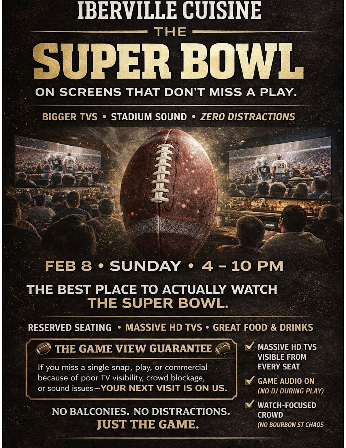 Iberville Cuisine is built for fans who actually want to watch the Super Bowl—not fight crowds, crane their necks, or miss key moments. With massive HD TVs visible from every seat, stadium-quality sound, and a focused game-day atmosphere, you’ll catch every snap, replay, and commercial.