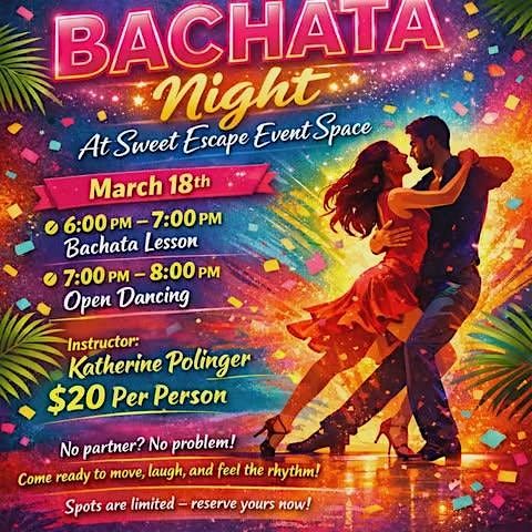 Join us at Sweet Escape Event Space on March 18th for a vibrant Bachata Night!