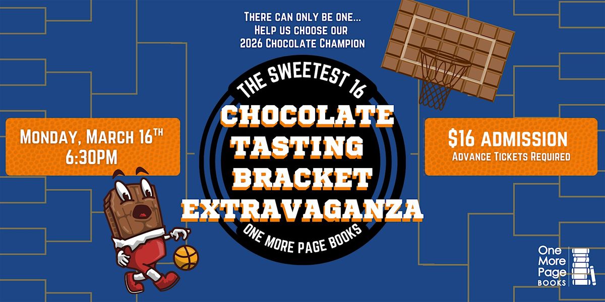 This year, for the first time, you can also opt to stay home and play your own Bracket! Purchase a take-home Chocolate Tasting Bundle ticket, which will include 2 samples of each chocolate, along with a bracket. Taste your way through your own Sweetest 16--or order more than one to share with a group! You can pick these up at One More Page starting Friday, March 13th.