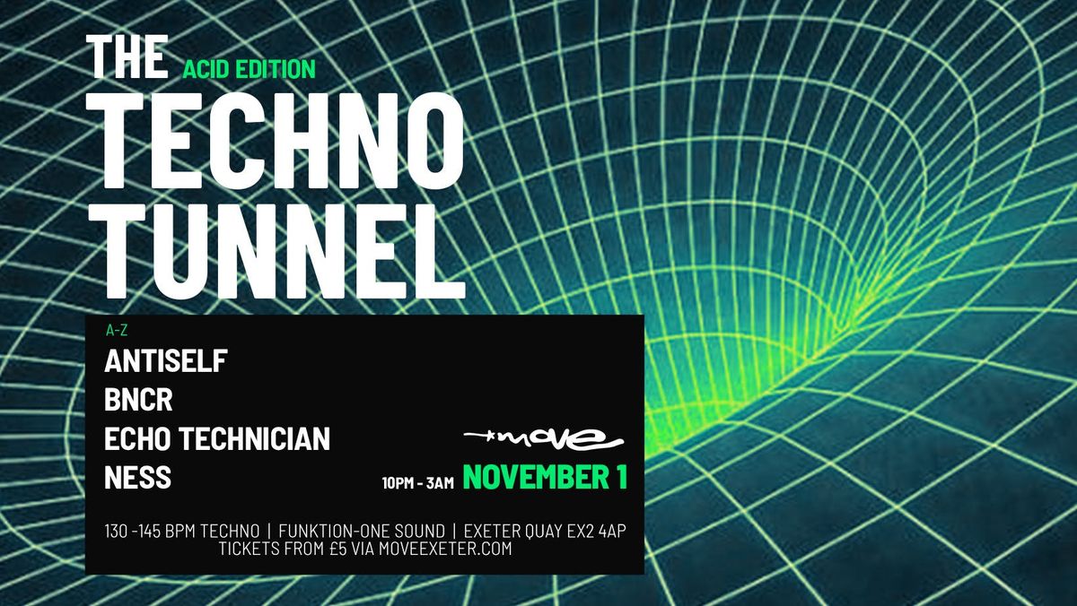 MOVE PRESENTS: The Techno Tunnel - Acid AdditionThe Techno Tunnel is fast becoming one of the South West’s go-to spots for proper techno heads. Last time went off, and this one’s set to go even harder. We’re diving headfirst into the world of ACID - squelchy 303 lines, driving kicks, twisted grooves, and that late-night warehouse energy all night long.DJ's A-Z:Antiself BNCREcho TechnicianNessMove, ExeterSaturday 1st November10pm - 3am🎫 £5 online / More on the door